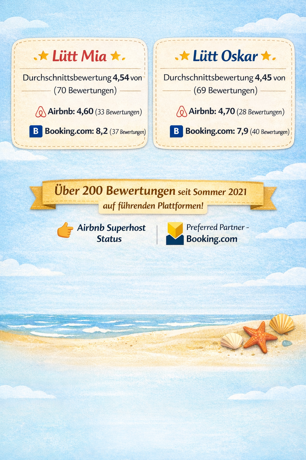 Luxuriöse Ferienwohnungen mit zwei Schlafzimmern, zwei modernen Bädern, gut ausgestatteten Küchen, großzügigem Wohnbereich mit Schlafcouch, kostenlosem Parkplatz und Internetzugang für jede Wohnung, moderne Einrichtung mit Smart-TV, kinder- & haustierfreundlich, optional buchbarer XXL-Strandkorb (saisonal).